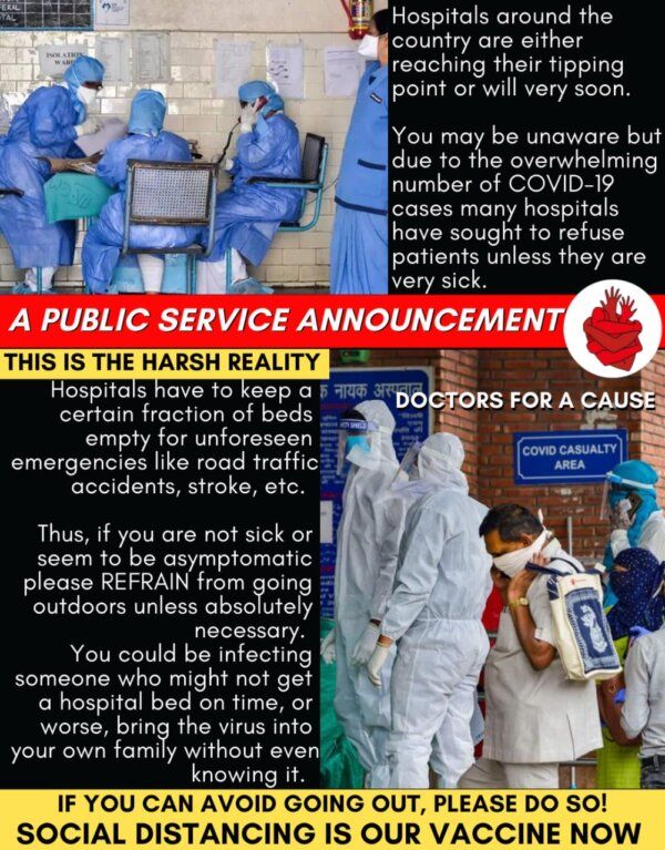 The ongoing COVID-19 pandemic continues to claim lives everday around the globe. Since a nationwide lockdown is not feasible for such extended periods of time, some parts of the country have started with the unlocking phase. However THIS is the time when you should avoid going out until there’s an absolute necessity to do so and prevent yourself and your family from exposure. Most hospitals are almost at full capacity and the medical caregivers are working round the clock to ensure well-being of the affected patients, often risking their own lives. The least we can as do citizens is to stay indoors to avoid further transmission of the disease and keep our family and community safe. This is an initiative under taken by my NGO, Doctors For A Cause, and attached below is a poster that the good people over there made as a PSA! Check it out and spread the word!